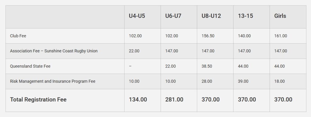 | Association Fee – Sunshine Coast Rugby Union | 22.00 | 147.00 | 147.00 | 147.00 | 147.00 |